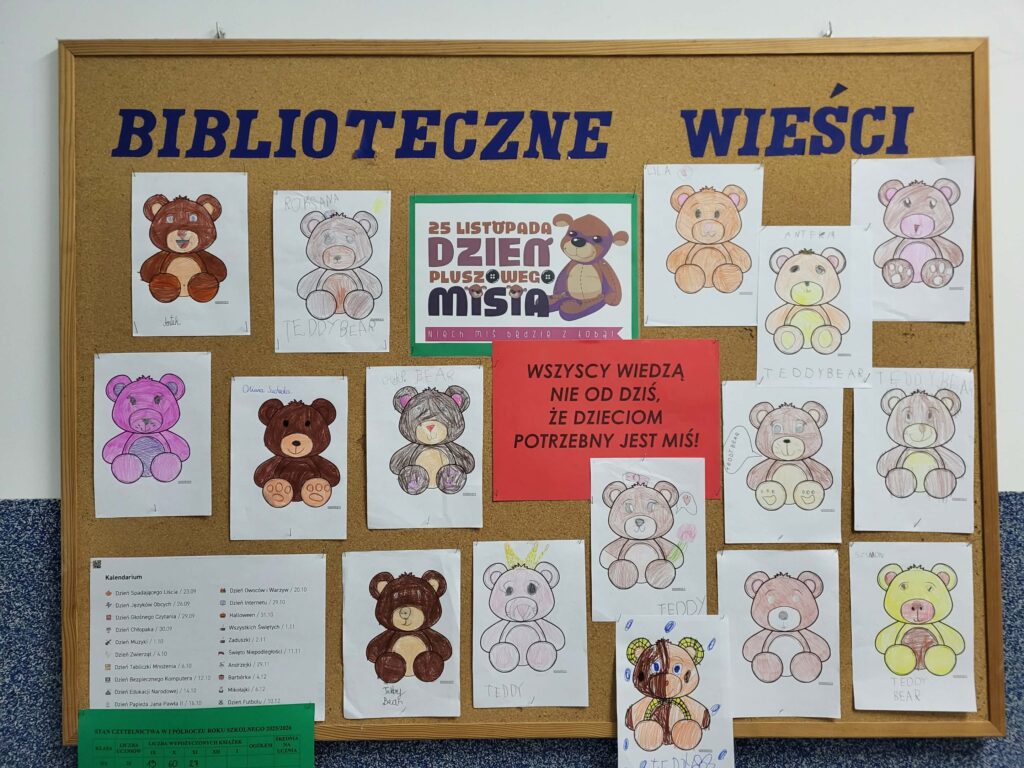 25 listopada w klasie Ia odbyła się lekcja biblioteczna z okazji Dnia Pluszowego Misia. Nasi mali uczniowie poznali historię powstania ulubionej zabawki wszystkich dzieci. Dowiedzieli się też dlaczego miś pluszowy to po angielsku teddy bear. Nauczyli się również rymowanki „Teddy bear, teddy bear, turn around”. Ponadto wysłuchali bajki opowiedzianej za pomocą teatru kamshibai w języku angielskim. Na koniec uczniowie pokolorowali pluszowe misie. Z tych prac powstała piękna gazetka przy bibliotece szkolnej.